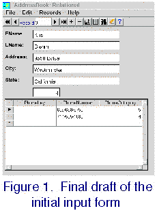 last month. We especially wanted to remember how difficult it was to manually add a person to our relational style address book. Keeping two machine generated keys in mind and later inserting them into the Phones table without making an error is difficult. To remedy that problem we built a form to do the "under the covers" work (fig. 1).