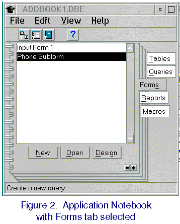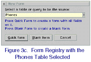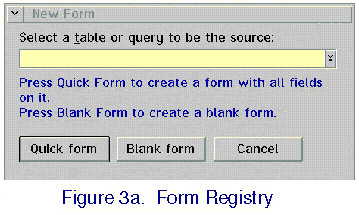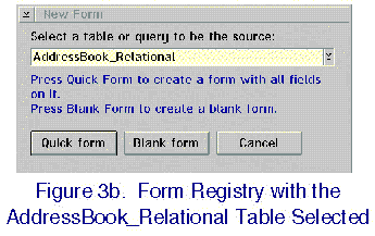 Forms are created by selecting the Form tab on the Application Notebook (fig. 2) and clicking the New button. This brings up the form registry dialog box (fig. 3a). Forms are generally tied to one table or query. We will be working directly with table AddressBook_Relational so click the arrow at the right end of the text entry box and select AddressBook_Relational from the drop down list.