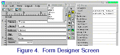 In fact, the form is usable as it is. To test it, click on the left most icon just under the File menu heading. All of the names and addresses can be viewed by scrolling through the table using the VCR controls (they are under the menu - as you can see in fig. 1. Note: when you place the cursor on a VCR control, the action that control will take is shown at the bottom of the window.).