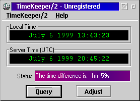 Then, about two months ago, I heard about a program called TimeKeeper/2 through the WarpCast broadcast. This is a neat, highly configurable little utility from BMT Micro. Basically, it queries a time base (there are predefined ones, but you can add your favorite if it isn't there already) and displays the difference between UTC and your system time. If you wish, you can adjust (translation: correct) your system time. The utility even accounts for the daylight savings time switch, which is a nice touch. There is no programmer attribution, but it is copyrighted by BMT Micro, themselves.