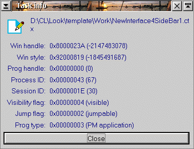 When the mouse pointer is rested on a cell, the name of the process is displayed in a text bar that grows from the cell. A right mouse button click on an icon displays the context menu for that task. For most tasks, the context menu is quite a bit more detailed that the equivalent context menu for the task in the OS/2 Window List. At a minimum, each Task Switcher context menu contains "Exception", "Info", and "Close" entries. The "Close" entry is self explanatory. I haven't yet figured out the use of the "Exception" entry, but the "Info" entry presents a window (see example below) containing the complete system path of the object, window style and handle, the program handle, process ID, session ID, visibility and jump flags, and program type -- interesting information, if only academically for most of us. A button at the bottom of this window dispatched it.