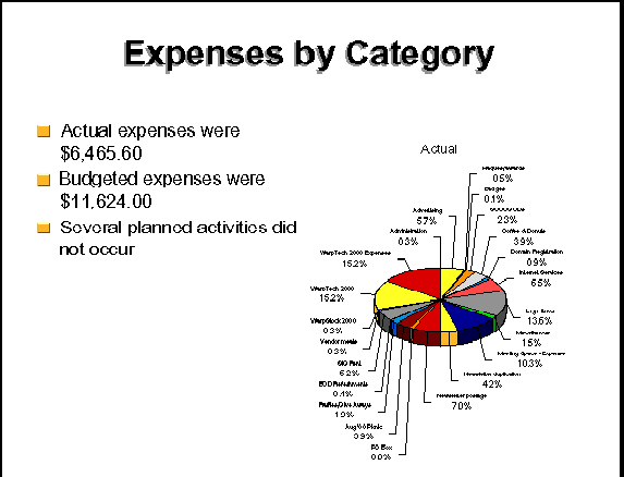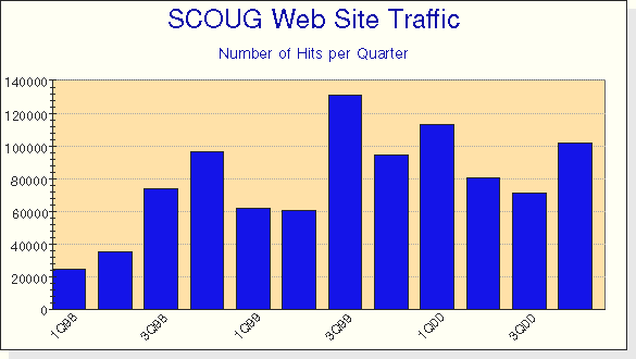 One of the things SCOUG prides itself on is this web site. Rollin's chart of web site traffic shows that we get a lot more people coming to the site during our big events and when articles are promoted through other OS/2 venues. Surprisingly, Rollin reported that our members make much less use of the web site than others do. We seem to make little use of SCOUG's mailing lists as well.