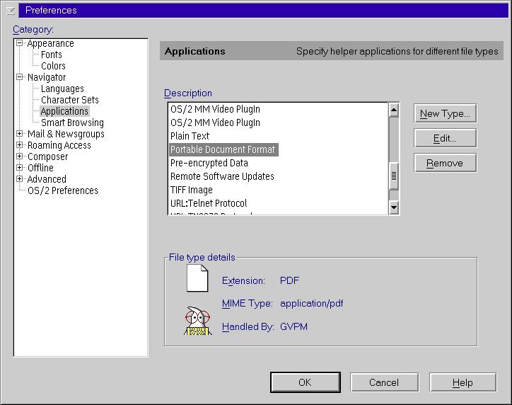 Anyhow, when you do all this and save the result, you will have a new gee whiz pdf file viewer that will run within Netscape, just like Acrobat4 Reader does on those 'other' operating systems. To check your results before exiting the applications dialog box , you can click on the Applications box to make sure that your new Portable Document Format file association is listed. You should see something like the following: