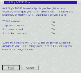 Junk Spy is simple to install, but it does require the right TCP/IP settings to work. For those of us who can't spell network, setting up a loopback interface with the right settings can seem pretty intimidating. Sundial has simplified this task with the familiar Windows Wizards. The Wizard guides you right through setting up your network interface; even if you don't have a nic (network) card, and even if you don't know what the Wizard is talking about, you should be fine just accepting the program's default recommendations.