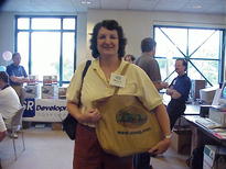 SCOUG Treasurer Melanie Chernoy shows off her one-of-a-kind SCOUG tote bag.
