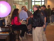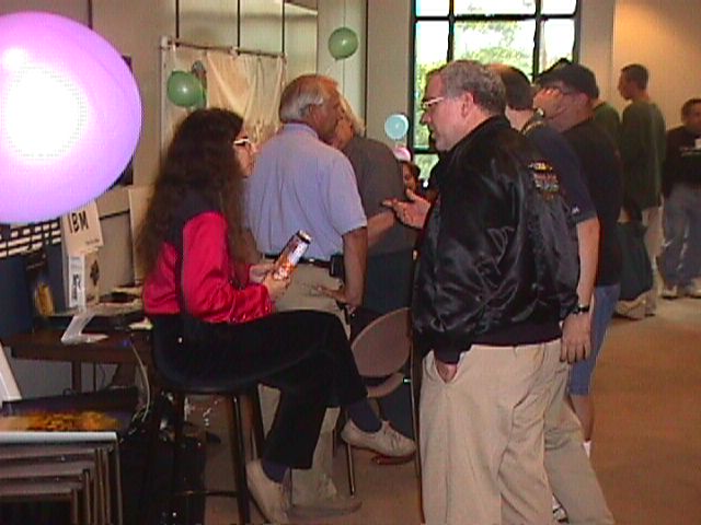 Esther Schindler and Roger Mason talk near the IBM exhibits.