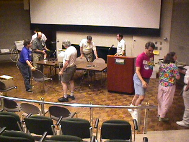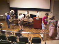 Everyone worked hard to clean up after Warped Jeopardy! for the next presentation.